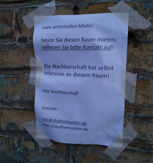 Die stärksten Forderungen waren die nach dem Erhalt des "kieznahen Gewerbes" und wirklich bezahlbare Mieten. Für die größte Empörung sorgte die Erzählung eines Nachbarn aus dem alten "sozialen" Wohnungsbau in der Obentrautstraße. Dessen Vermieter hat kurz zuvor allen MieterInnen in seinem Haus die Umlage der Kostenmiete angekündigt. Die Miete soll um das anderthalbfach steigen, und das mitten im angedachten Sanierungsgebiet.