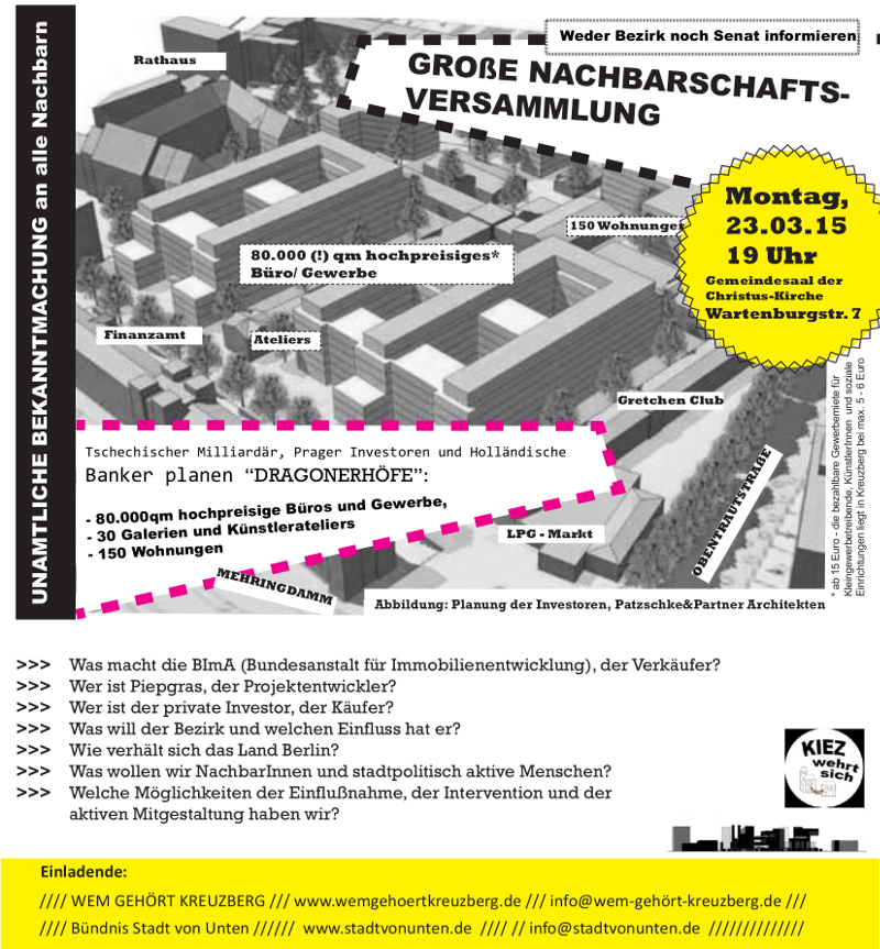 Zur Veranstaltung laden die Stadtteilinitiative ‘Wem gehört Kreuzberg’ und das Bündnis ‘Stadt von Unten’ ein.