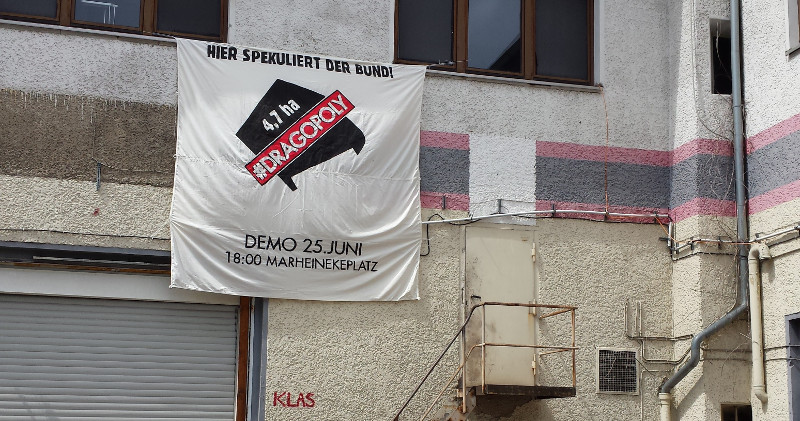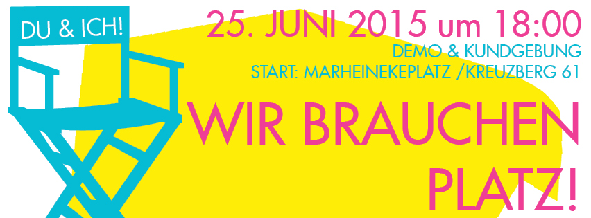 Wir laden am _25. Juni, unter dem Motto „Wir brauchen Platz“_, zur Demo und anschließender Versammlung ein. Los geht es _um 18 Uhr am Marheinekeplatz_, Ziel ist das sogenannte Dragonerareal.