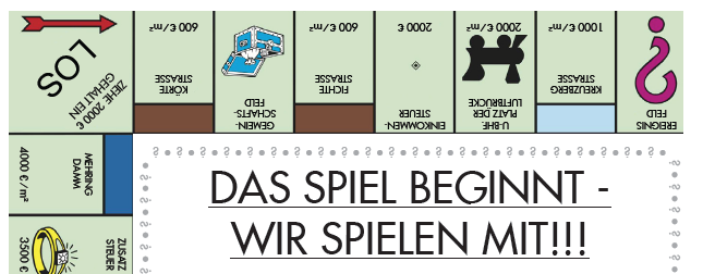 Wir laden euch herzlich ein: Kommt vorbei, informiert Euch und lasst Euch überraschen von Kleinkunst, Musikbeiträgen, einer Ideenwerkstatt und … einem großen Monopoly-Spiel.
