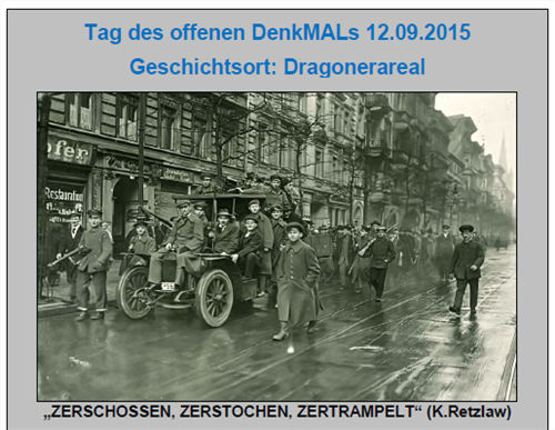 Die Nachbarschaftsinitiative /„Dragopolis“/ und die /„Initiative Gedenkort Januaraufstand “ /laden ein, mit euch gemeinsam am Tag des offenen Denkmals auf dem Dragonerareal an die zentrale Bedeutung der Dragonerkaserne während des Januaraufstandes 1919 und an die am 11.01.1919 hier ermordeten Parlamentäre aus dem besetzten Vorwärtsgebäude zu erinnern.